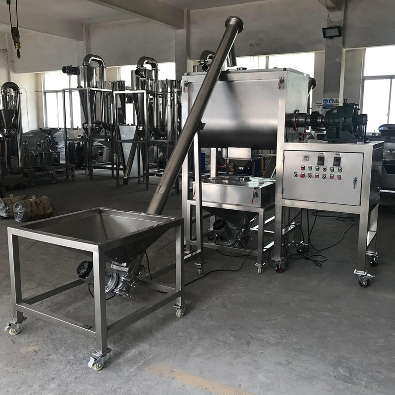 c: Lini produksi: Blender pita ganda dapat bekerja dengan konveyor sekrup, hopper, dan pengisi auger untuk membentuk jalur produksi.